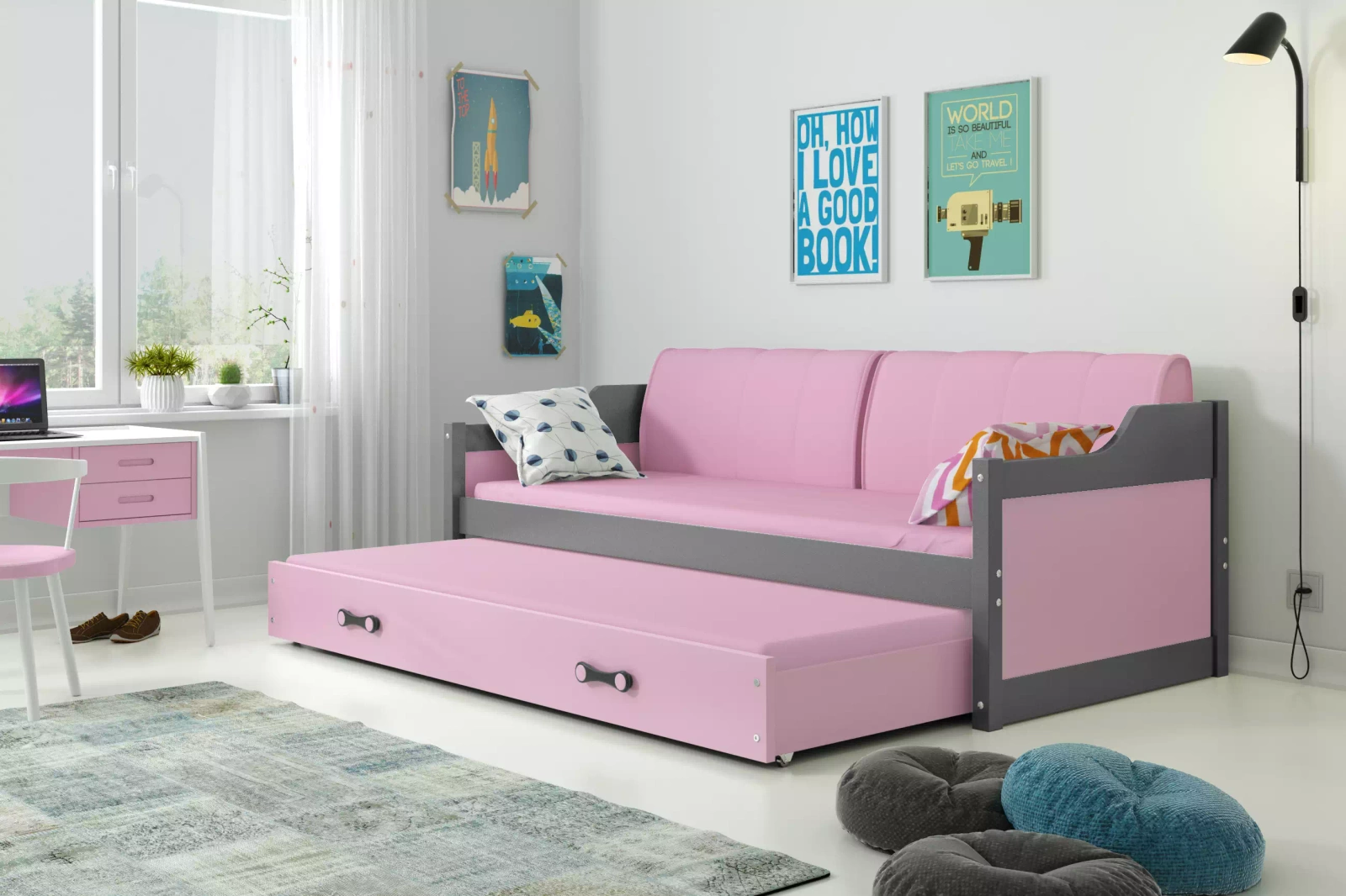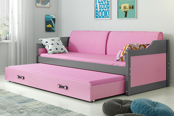 David je rozkládací postel v růžové a grafitové barvě, která se jistě bude líbit dívkám. Toto rozkládací lůžko pro 2 osoby vybavené dvěma matracemi má plochu na spaní 90x200 cm v horní části a 80x190 cm ve spodní části. Matrace umístěná ve výsuvné zásuvce se v noci snadno vytahuje a přes den ukládá, takže děti mají více prostoru na hraní.
