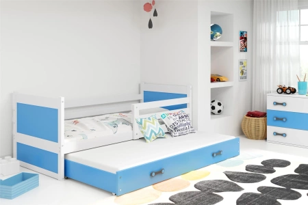 Je to ideální řešení pro vás, pokud hledáte řešení pro své dvě děti a zároveň vám záleží na tom, abyste co nejlépe využili prostor i v malé ložnici. Kufrová postel Rico je také vynikající volbou, pokud je vaše dítě společenský člověk, který vítá kamarády. Spodní lůžko uzavřené v posuvné zásuvce je stabilní a bezpečné a dokonale splňuje všechny požadavky. Lze ji používat denně i příležitostně, a když je přes den schovaná, nabízí více prostoru na hraní, což vaše ratolesti jistě ocení. Díky rozměrům 90x190 je to investice na dlouhá léta. Skvěle se hodí do ložnice tříletého dítěte a dospívajícího. Ochranná lišta v přední části umožňuje přizpůsobit tuto postel mladšímu dítěti. Ochrání vás před pády, i když váš poklad ve snu překypuje energií. Díky této univerzálnosti je to investice na mnoho let dopředu. Zábrana je odnímatelná, takže až bude dítě starší, můžete ji sundat. Bílá je univerzální řešení, které vám dává neomezené možnosti designu. Použili jsme antialergickou barvu bez zápachu, která byla plně testována a je vhodná i pro nejcitlivější dětskou pokožku, takže její používání je ještě pohodlnější. Modrá barva zásuvky dodává posteli lehce chlapecký nádech. Úchyty se zajímavým, lehce futuristickým designem vnesou další dekorativní prvek.