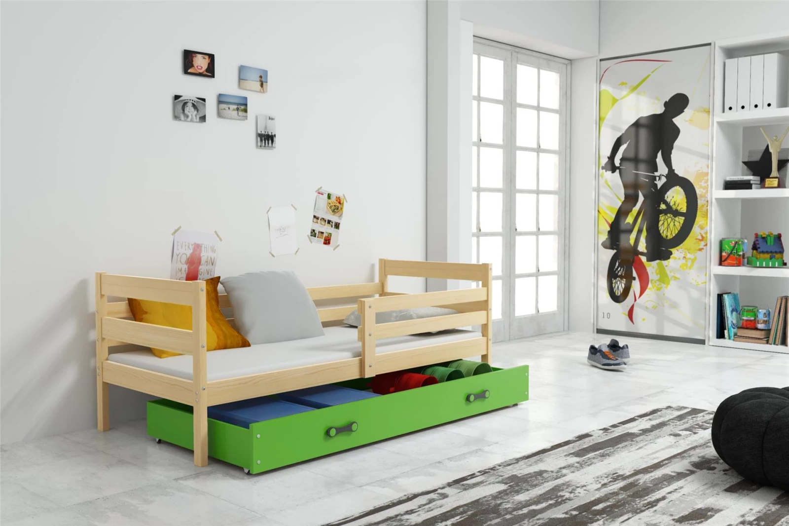 Jednolůžko pro dospívající ERYK 90X190 s matrací a zásuvkou, borovice/zelená