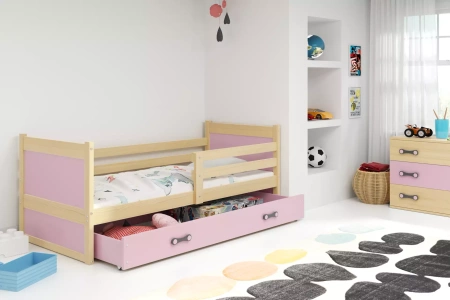 Jednolůžko pro dospívající Rico 90x190 s matrací a zásuvkou, borovice/růžová