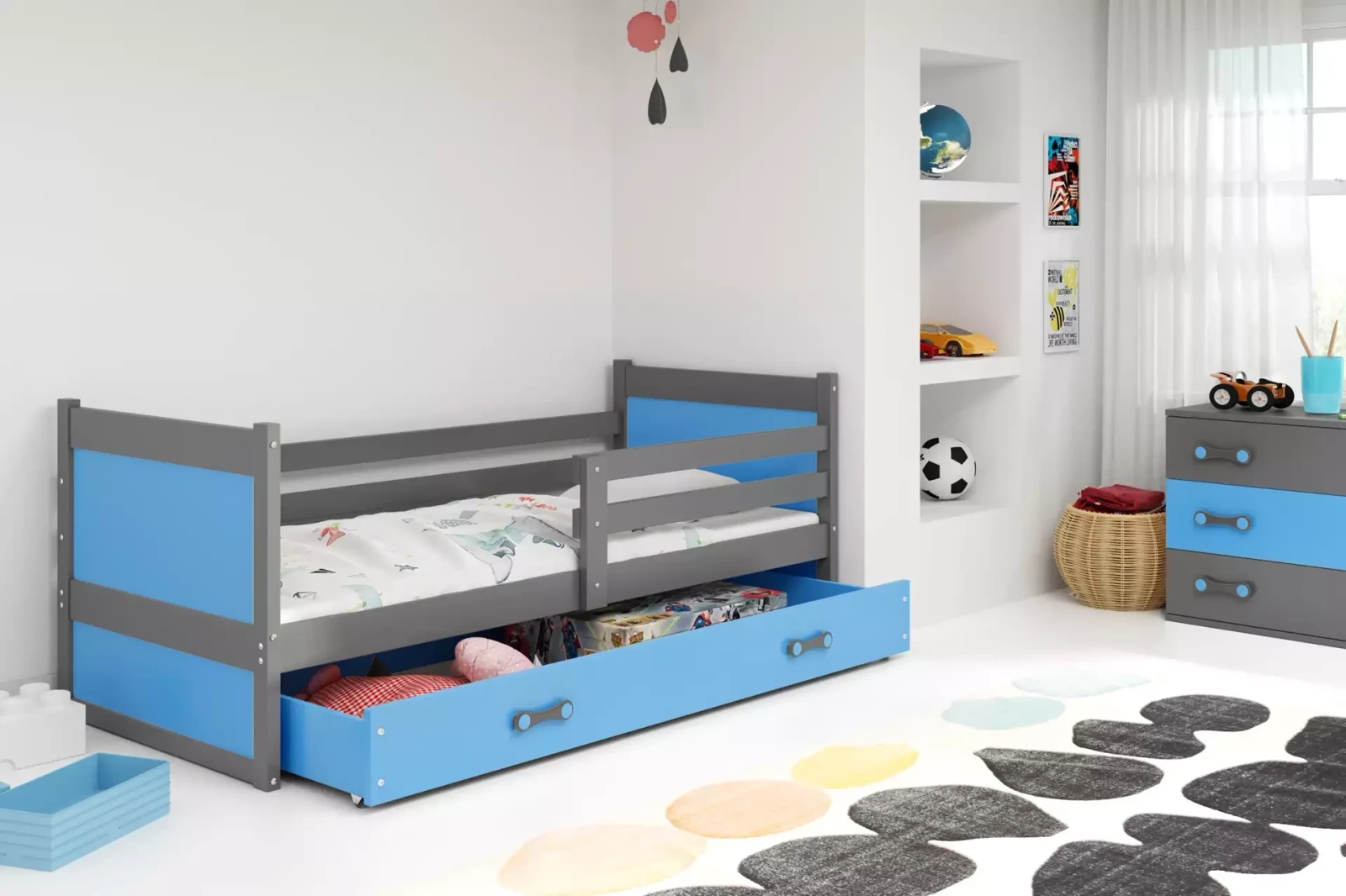 Zobrazená jednotka má velkou zásuvku. Je ideální pro ukládání nejrůznějších věcí, například oblečení nebo lůžkovin. Zásuvka má kolečka, takže je snadno a prakticky vyjímatelná. Všimněte si pečlivě vyrobených úchytů, které celou věc dělají ještě atraktivnější. Modrá zásuvka ve spodní části potěší všechny chlapce. Lze ji použít jako místo pro lůžkoviny nebo jako další úložný prostor pro hračky. Praktické řešení, které si oblíbíte především tehdy, pokud máte rádi pořádek. K této postýlce lze dokoupit matraci s klimatizačním vláknem. Samotný potah je vyroben z hypoalergenní tkaniny, takže je vhodným řešením pro děti trpící alergiemi.