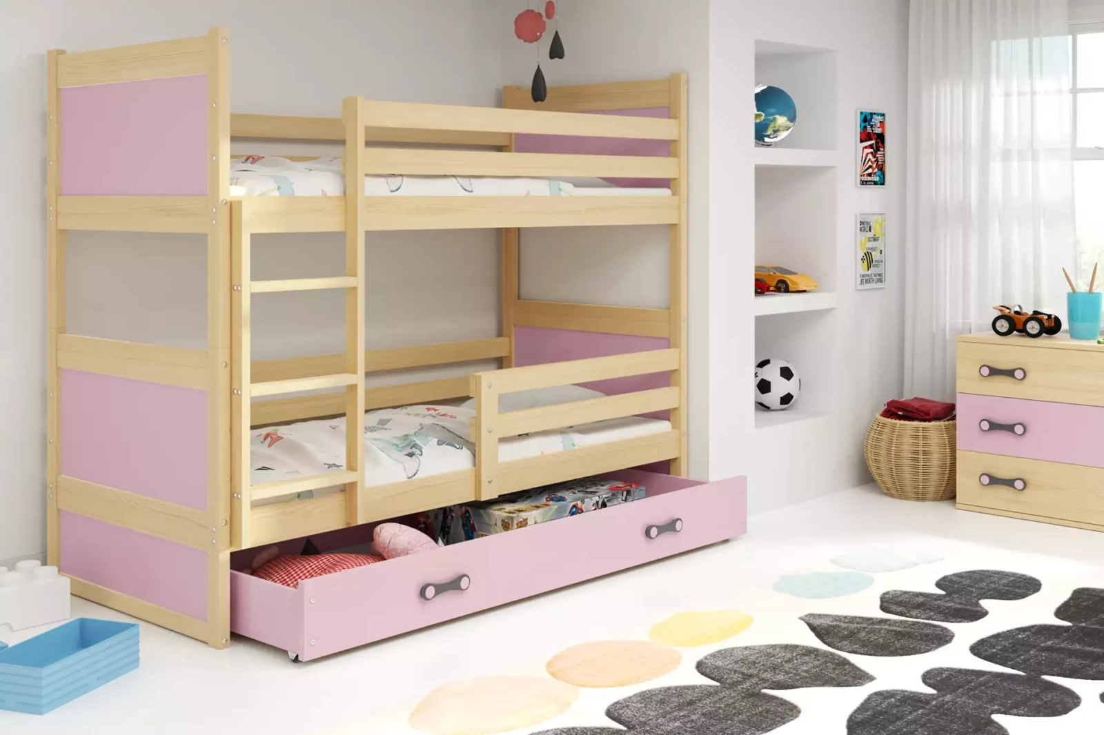 Juniorská patrová postel 90x190 se zásuvkou - Rico pine/pink s matrací