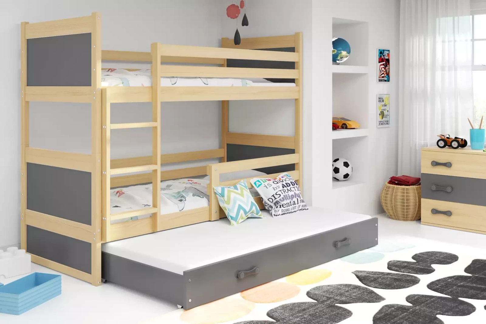 Juniorská postel pro tři osoby RICO 90X190 se zásuvkou, borovice/grafit