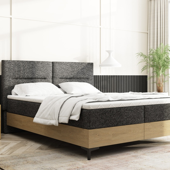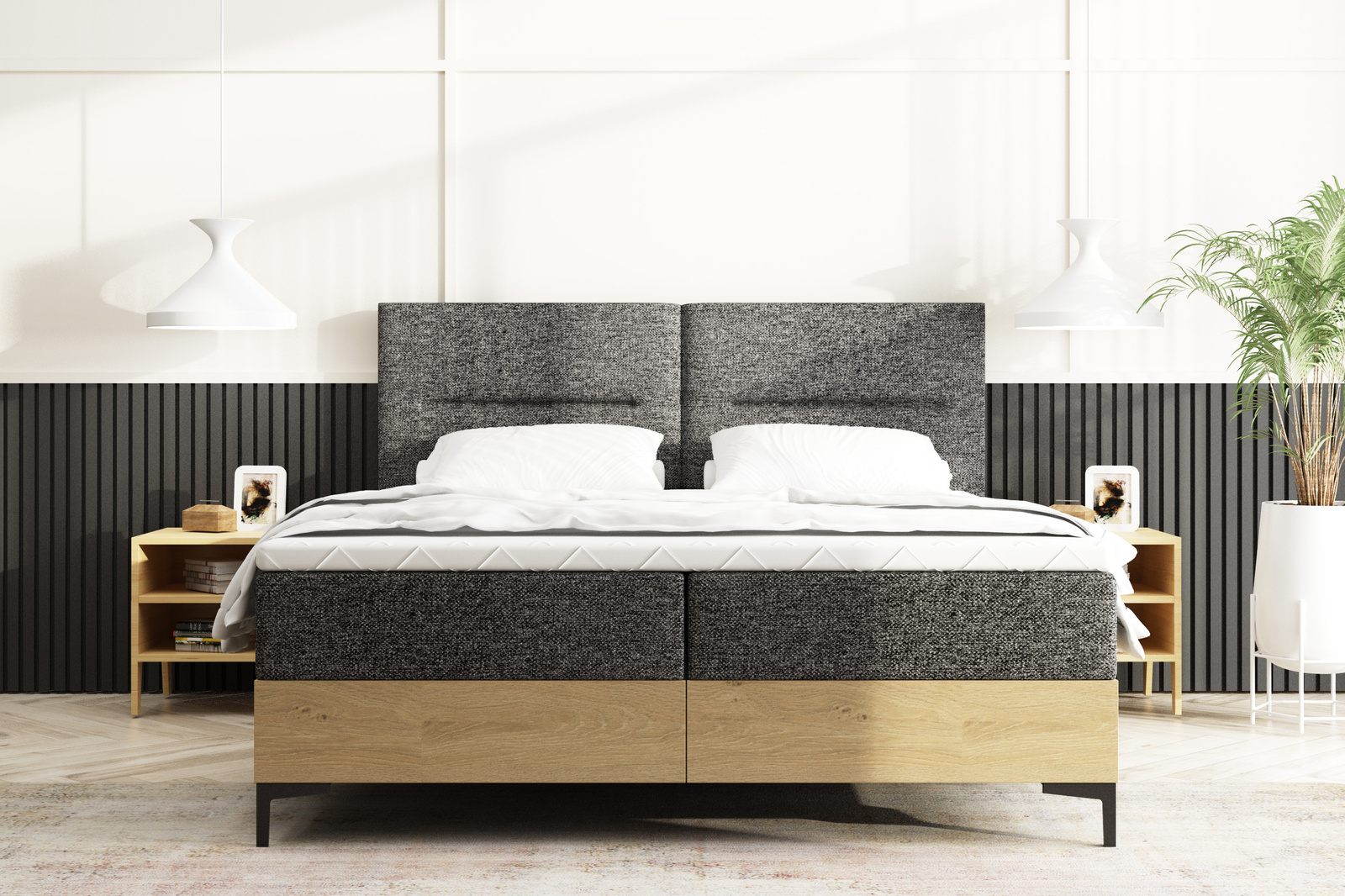 - Elegantní kontinentální postel 140x200 s úložným boxem je ideální volbou do každé ložnice. Je vyroben z přírodního dubového dřeva, nabízí dvě nádoby na lůžkoviny a pohodlí díky 2 pružným matracím. Čalouněné čelo postele dodává styl.