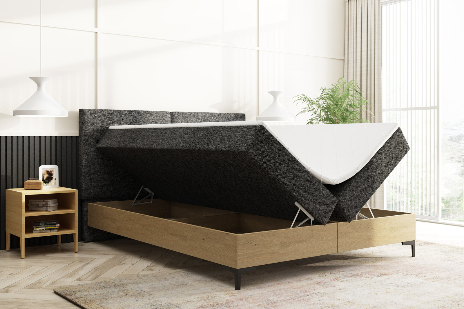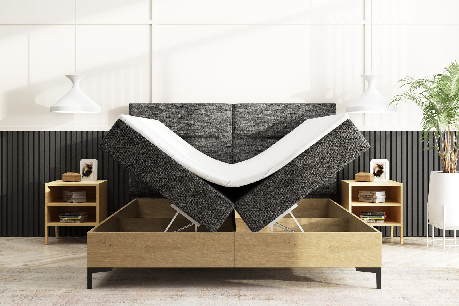 Jedním z klíčových prvků kontinentálního lůžka 160x200 s kontejnerem je jeho úložný systém. Dva koše s pružinovými zvedáky pro snadné a pohodlné uložení ložního prádla nebo jiného příslušenství. Díky tomu je ložnice přehledná a uspořádaná.