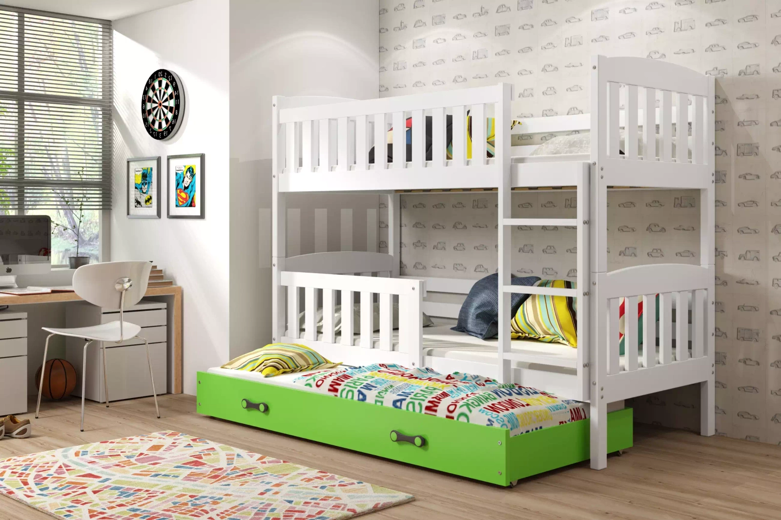 KUBUŚ 90X190 trojlůžko pro mladé se zásuvkou, bílá/zelená