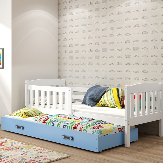KUBUŚ 90X190 výsuvná postel pro mladé se zásuvkou, bílá/modrá