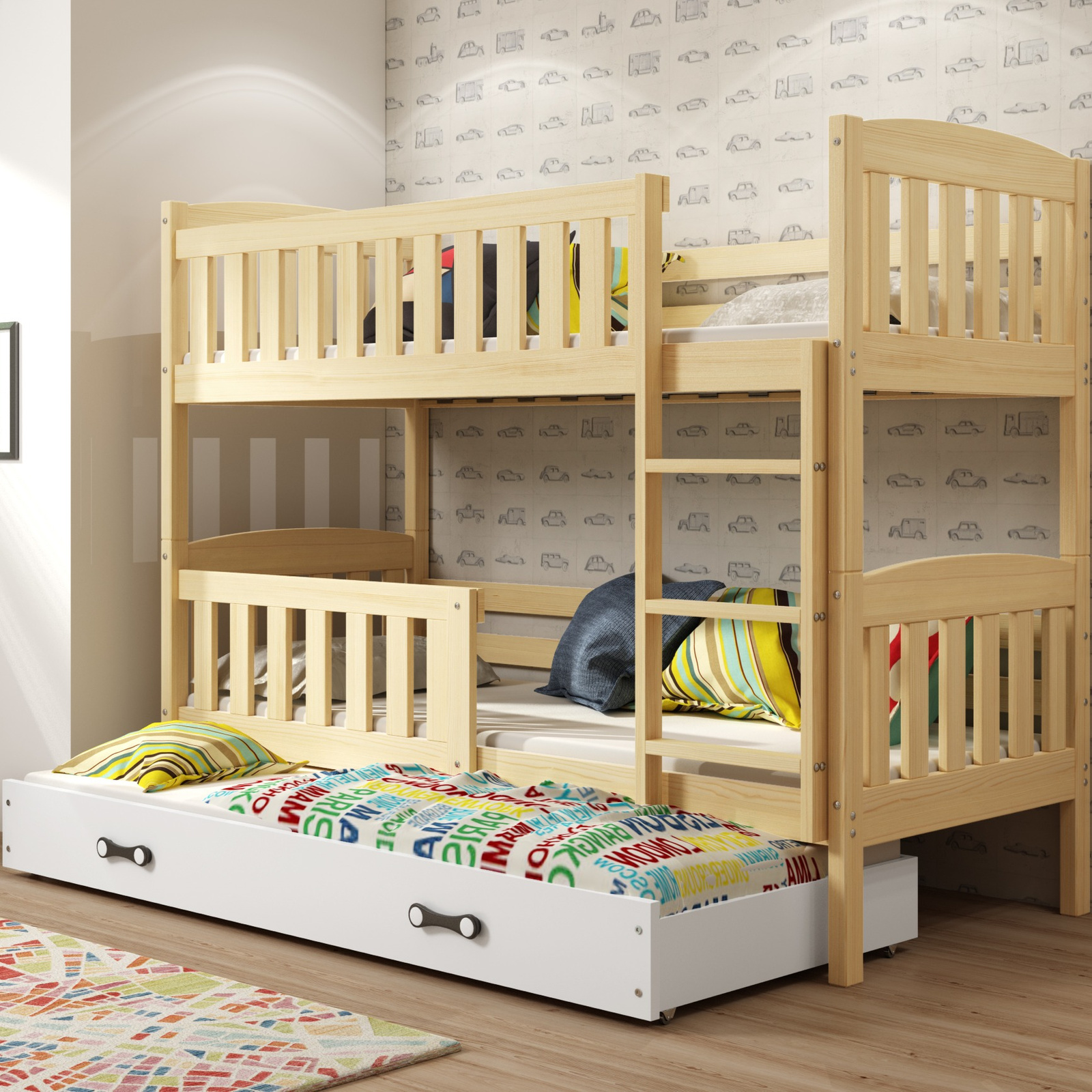 Třímístné lůžko Kubuś bylo vytvořeno s ohledem na větší rodiny. Umožní vám přizpůsobit jeden pokoj i pro tři vaše děti. Ve dvou obývacích prostorech je možné instalovat zábrany, které chrání zaneprázdněné batole před pádem a zajišťují jeho pohodlí a váš klid. Třetí lůžko je chytře ukryto v zásuvce pod postelí z odolné dřevotřísky. Může sloužit jako místo každodenního odpočinku pro jiné starší dítě nebo příležitostně pro kamarády vašich dětí, kteří se rozhodnou zůstat přes noc. Konstrukce je vyrobena z robustního borovicového dřeva a vyztužena ocelovými šrouby, které zároveň působí jako zajímavý dekorativní prvek. Žebřík lze namontovat na pravou nebo levou stranu. Rám z pružinových březových lamel poskytuje pohodlnou a stabilní oporu páteři a zlepšuje kvalitu spánku. Přírodní dřevo zateplí každou místnost.