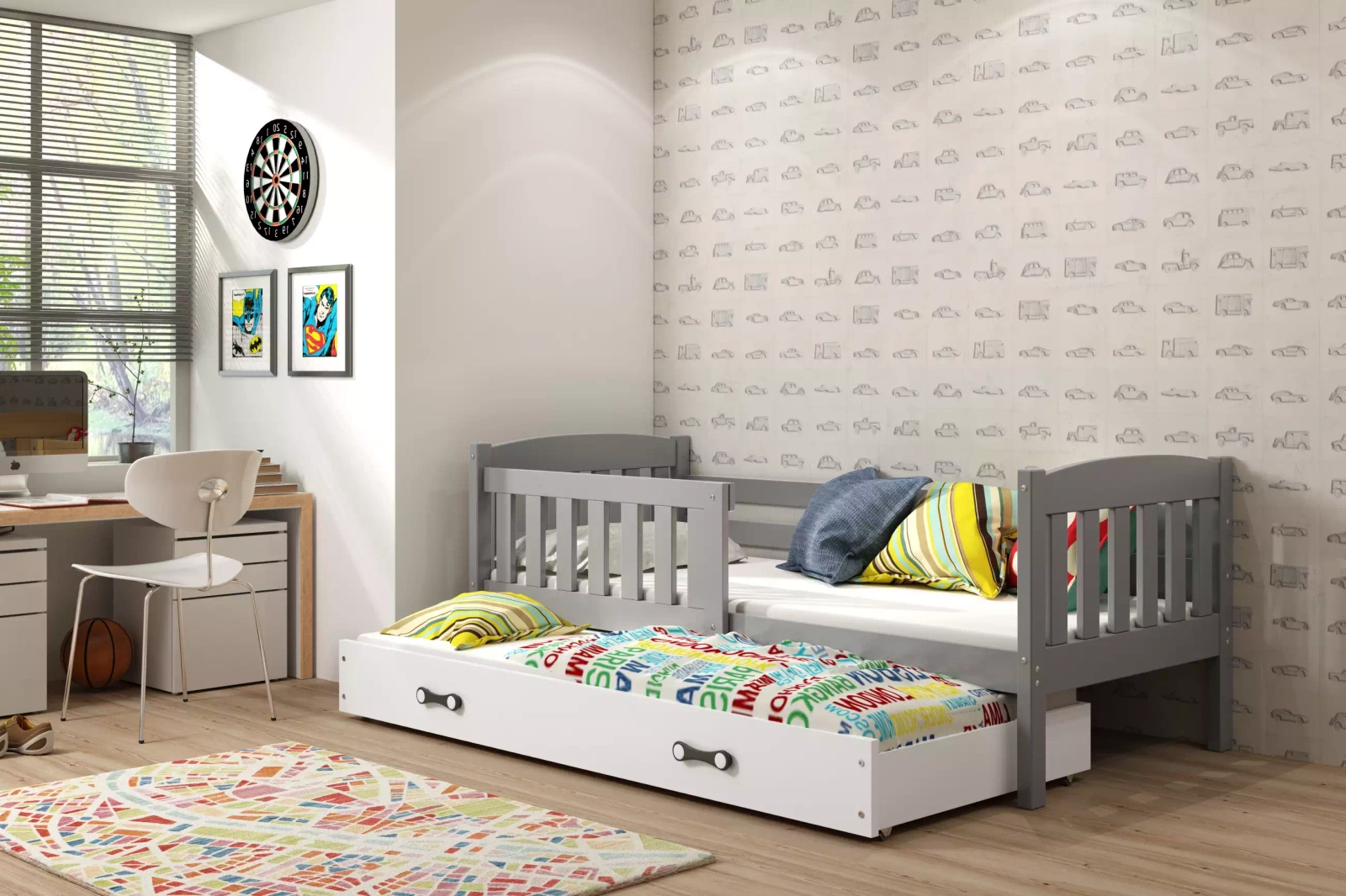 KUBUŚ 90X200 výsuvná postel pro mladé se zásuvkou, grafit/bílá