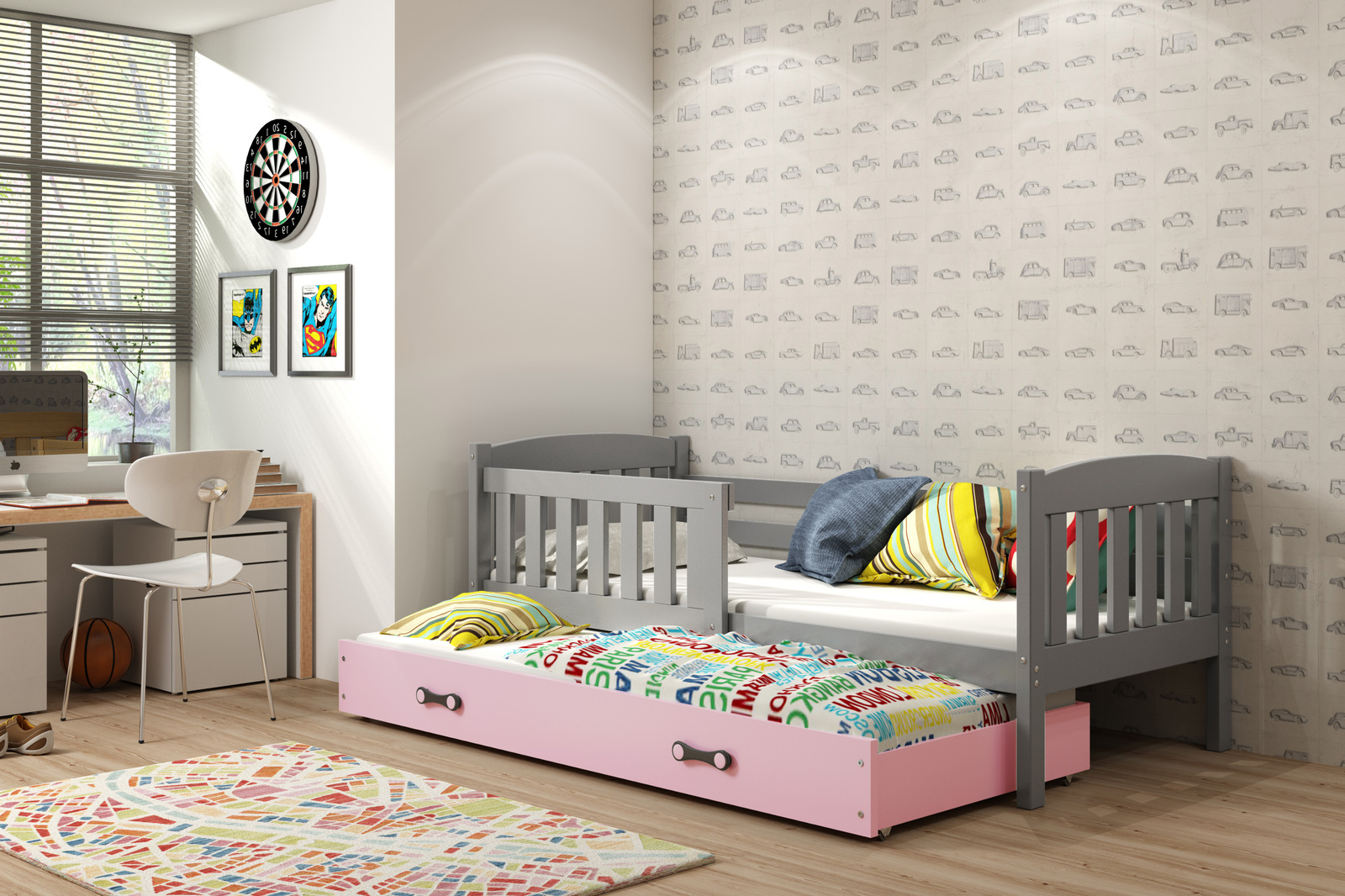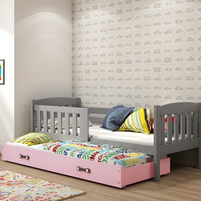 KUBUŚ 90X200 výsuvné lůžko pro mládež se zásuvkou, grafit/růžová