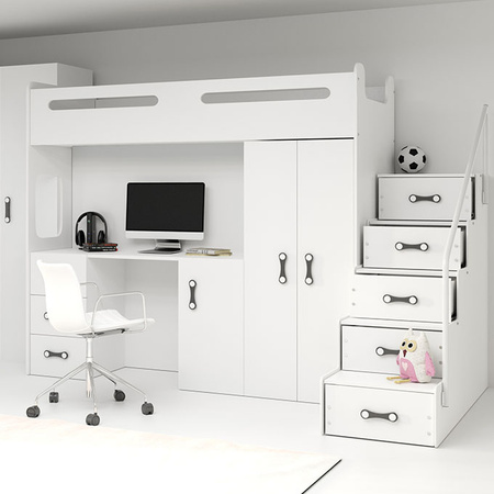 Tento univerzální bílý kus nábytku je nejen pohodlným místem na spaní, ale také funkčním řešením do pokoje pro mladé. Je vybaven praktickými úložnými prostory a skříňkami, které usnadňují organizaci prostoru, zejména v menších místnostech, kde je každý centimetr drahý. Bezpečnost navíc zajišťuje zábradlí a zaoblené hrany (poloměr R2), což je důležité zejména pro aktivní děti.