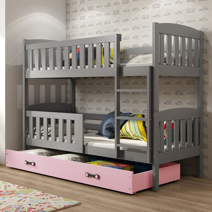 Patrová postel KUBUŚ 90X190 s matrací a zásuvkou, grafit/růžová