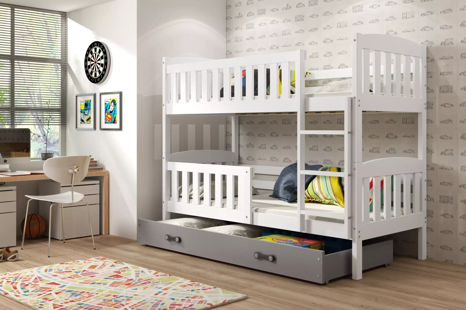 Patrová postel KUBUŚ 90X190 se zásuvkou, bílá/grafitová