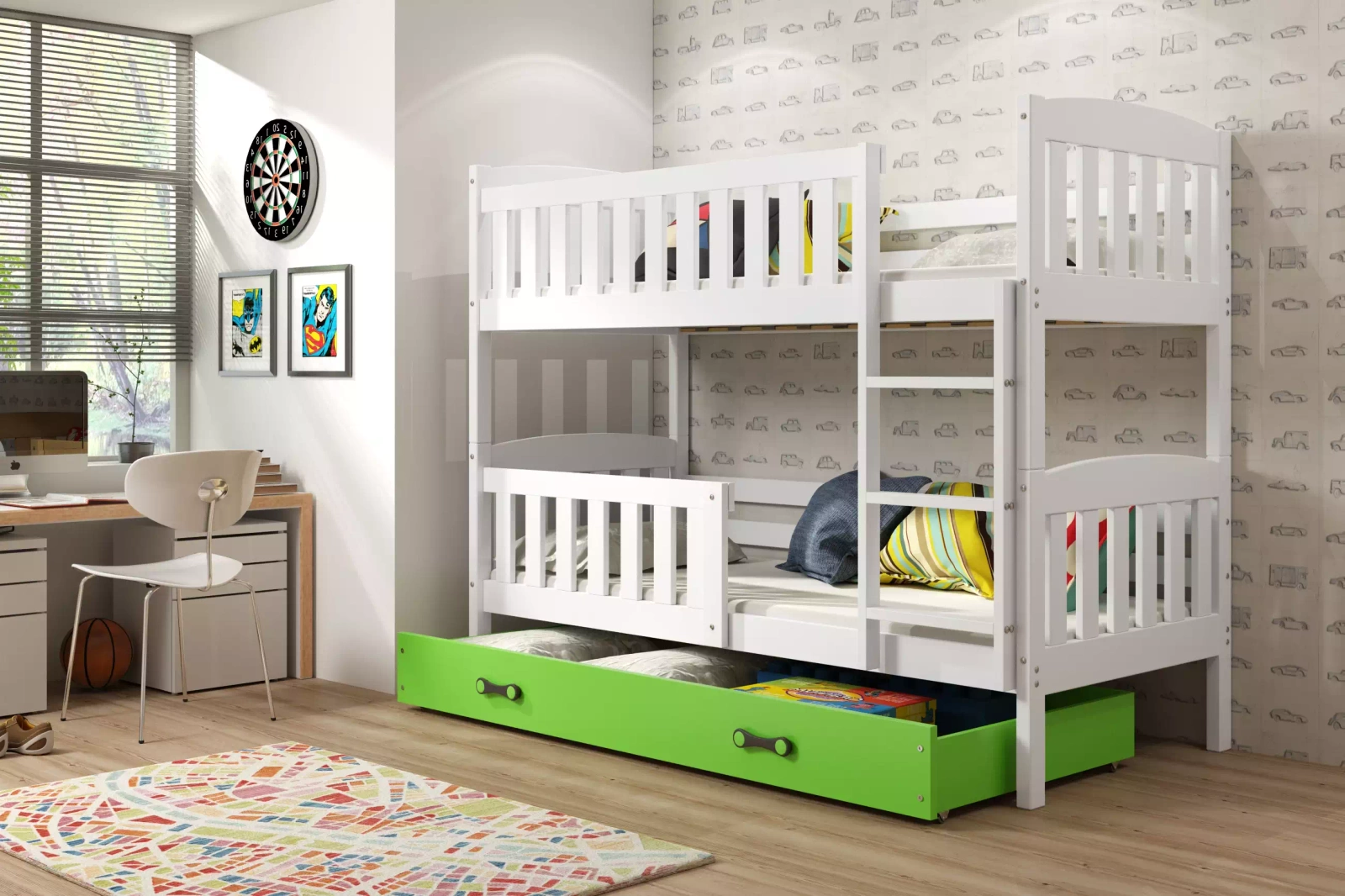 Patrová postel KUBUŚ 90X190 se zásuvkou, bílá/zelená