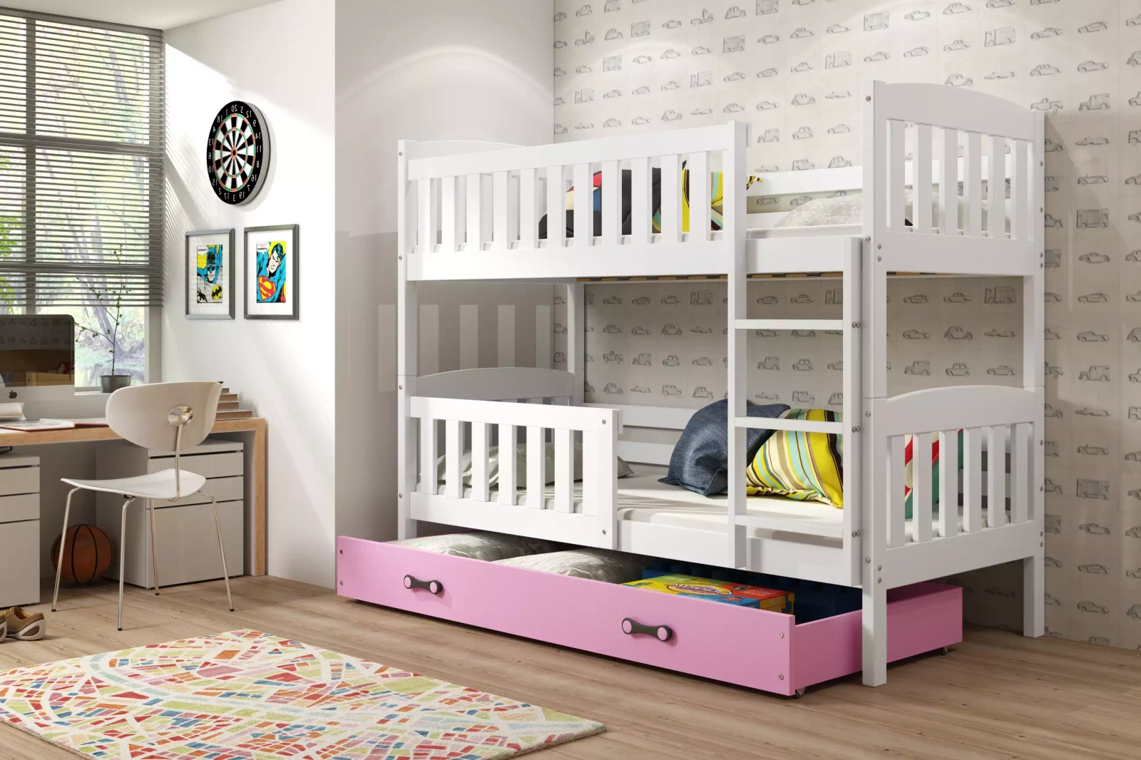 Patrová postel KUBUŚ 90X200 s matrací a zásuvkou, bílá/růžová
