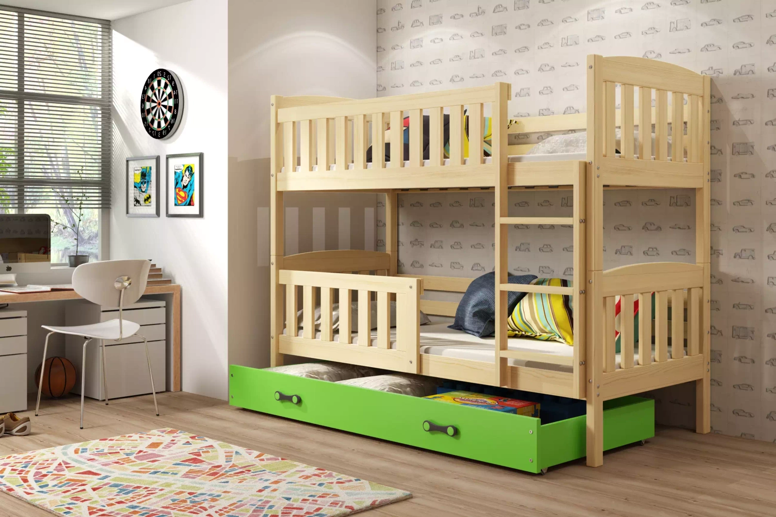 Patrová postel KUBUŚ 90X200 s matrací a zásuvkou, borovice/zelená