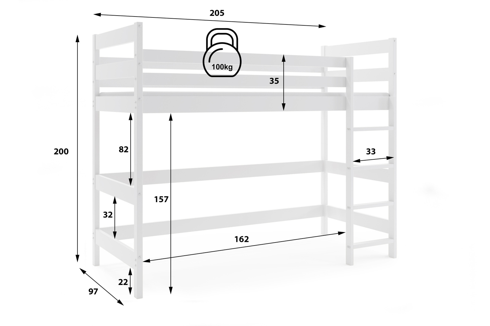 - Patrová postel pro mladé s plochou na spaní 90x200 cm je ideálním řešením pro ty, kteří šetří místem. Je vyroben ze dřeva a vyznačuje se bílým rámem, který dokonale ladí s jakýmkoli interiérem. Matrace není součástí dodávky.