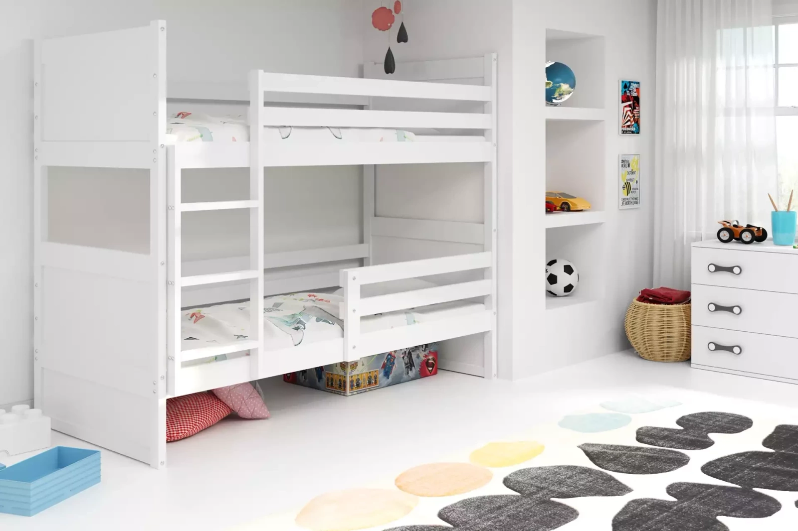 Ačkoli patrová postel RICO neobsahuje další úložný prostor ve formě zásuvky, nabízí možnost přizpůsobit tuto oblast individuálním potřebám uživatele pomocí různých košů či boxů na ložní prádlo nebo jiné předměty. Je to ideální řešení pro ty, kteří si cení minimalismu a chtějí si uspořádat prostor podle vlastních představ.