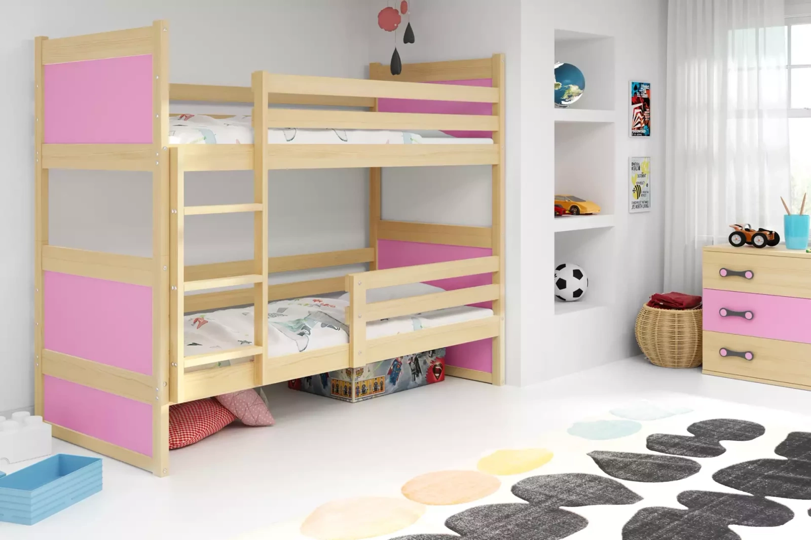 Mládežnická postel RICO je ideálním řešením pro sourozence nebo pro přespání kamarádů, spojující funkčnost a moderní design. Díky pevné konstrukci z borovicového dřeva zaručuje bezpečné a stabilní používání. Přírodní, nelakovaná barva rámu skvěle ladí s růžovými čely, které nábytku dodávají svěží a mladistvý charakter, snadno zapadající do pokoje dospívající dívky.