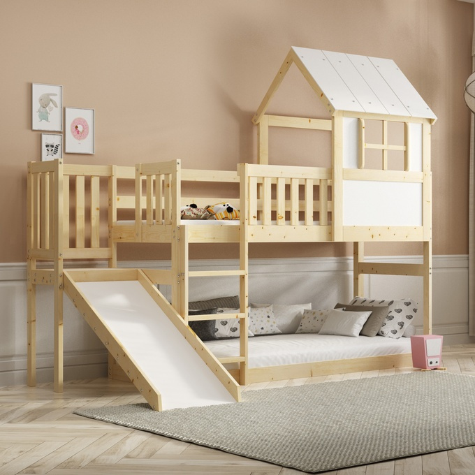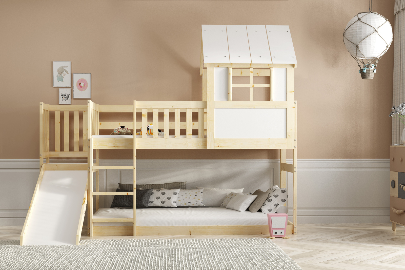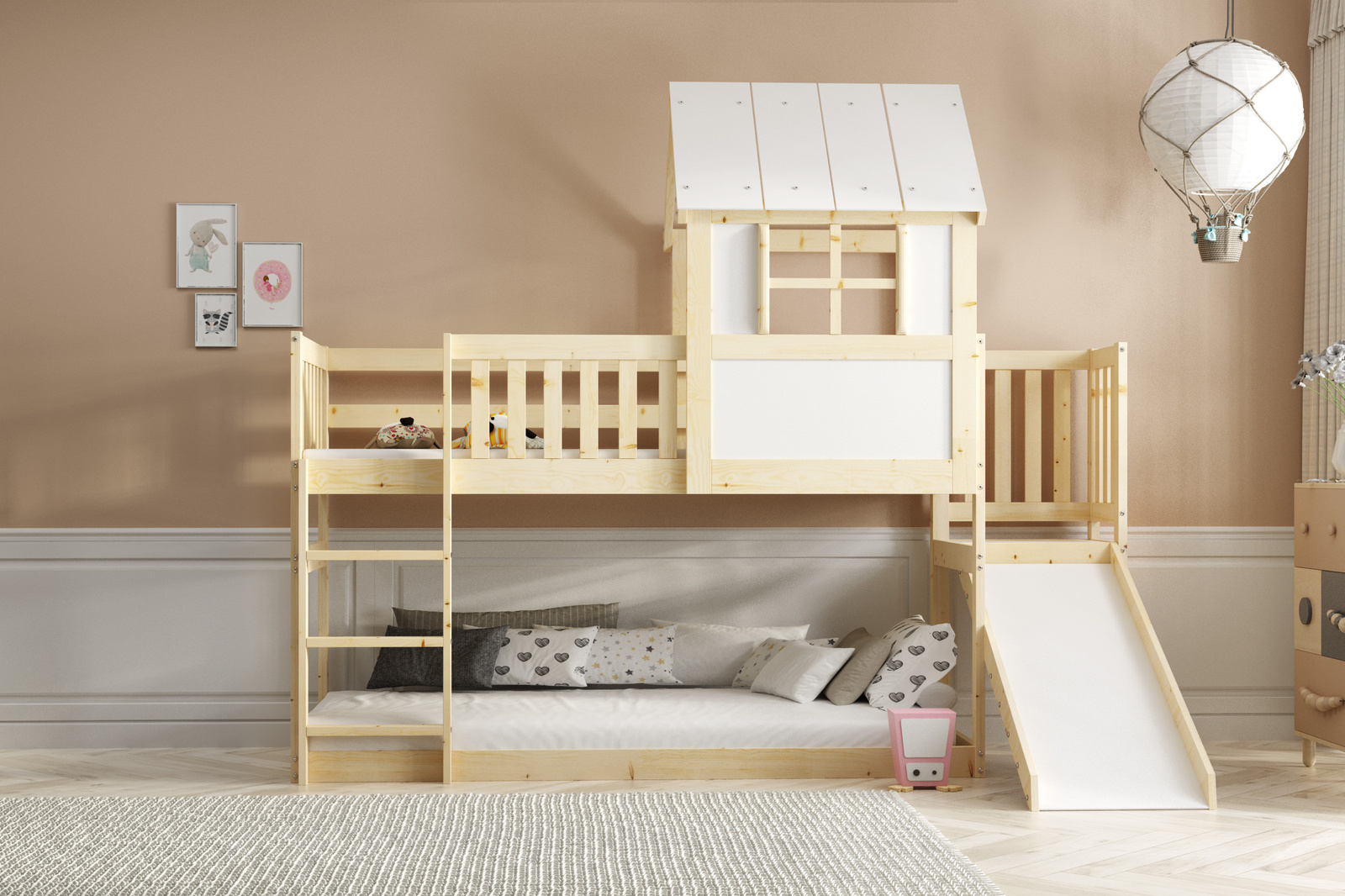 Patrová postel s domečkem a skluzavkou trochu připomíná pohádkovou konstrukci, která podněcuje dětskou představivost a vytváří atmosféru jako z kouzelného světa. Spací plocha o rozměrech 90x200 cm zajišťuje pohodlný spánek a díky své konstrukci mezonet se skluzavkou šetří místo v místnosti, což je důležité zejména v menších pokojích.