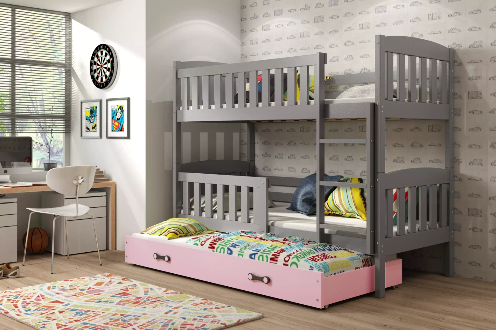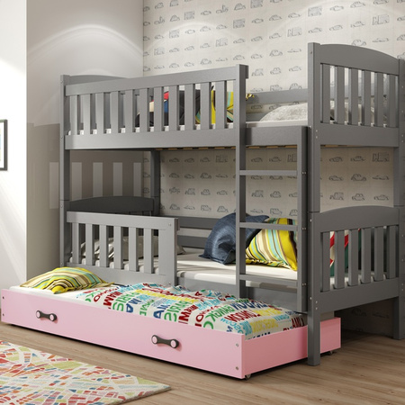 Třímístné lůžko Kubuś bylo vytvořeno s ohledem na větší rodiny. Umožní vám přizpůsobit jeden pokoj i pro tři vaše děti. Ve dvou obývacích prostorech je možné instalovat zábrany, které chrání zaneprázdněné batole před pádem a zajišťují jeho pohodlí a váš klid. Třetí lůžko je chytře ukryto v zásuvce pod postelí z odolné dřevotřísky. Může sloužit jako místo každodenního odpočinku pro jiné starší dítě nebo příležitostně pro kamarády vašich dětí, kteří se rozhodnou zůstat přes noc. Konstrukce je vyrobena z robustního borovicového dřeva a vyztužena ocelovými šrouby, které zároveň působí jako zajímavý dekorativní prvek. Žebřík lze namontovat na pravou nebo levou stranu. Rám z pružinových březových lamel poskytuje pohodlnou a stabilní oporu páteři a zlepšuje kvalitu spánku. Grafitová barva byla získána natřením povrchu dřeva zcela bezpečnou a antialergickou barvou, díky čemuž je výrobek bezpečný i pro děti s citlivou pokožkou.