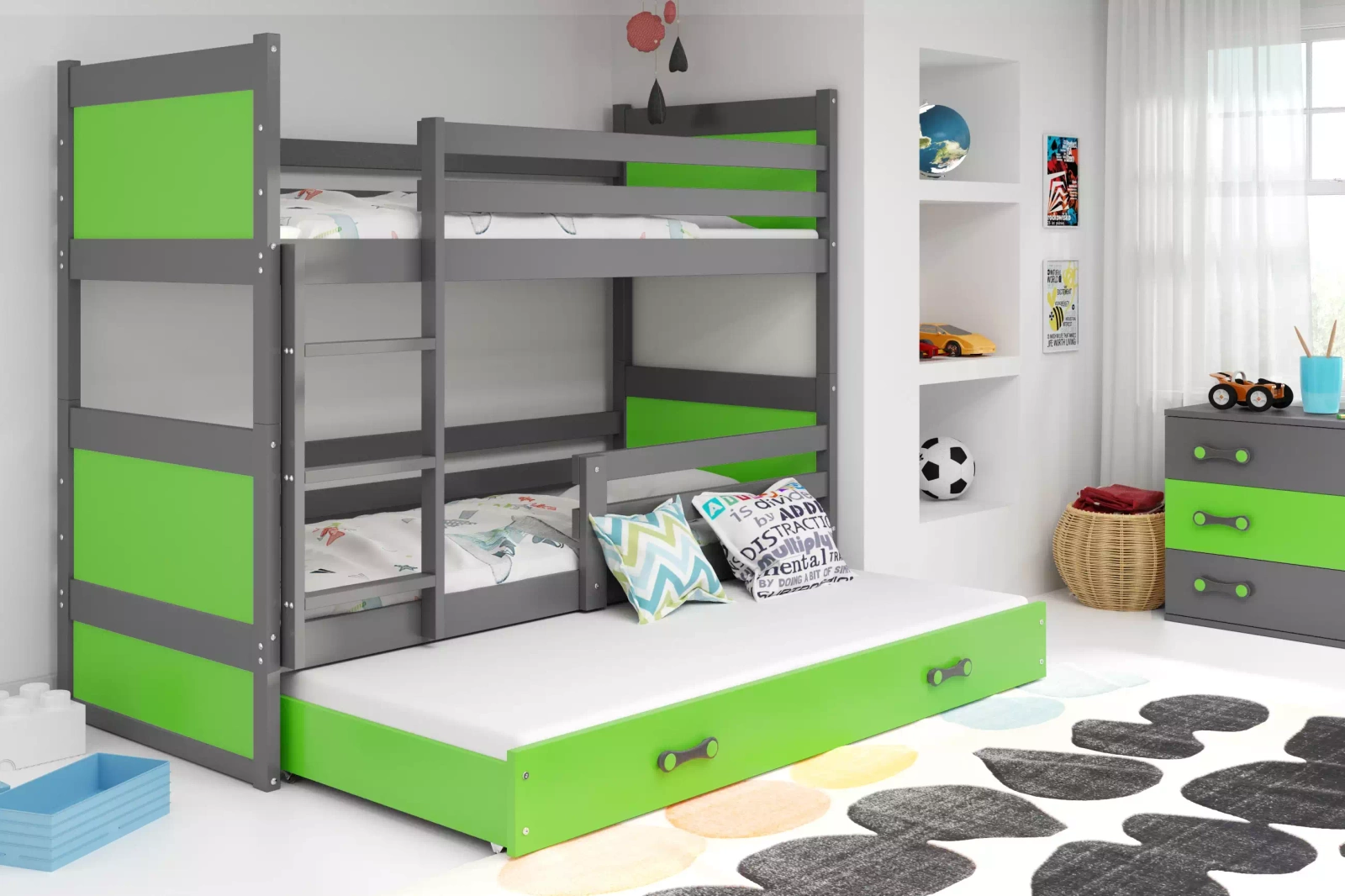 Postel pro mladé RICO 90X200 s trojpostelí a zásuvkou, grafit/zelená
