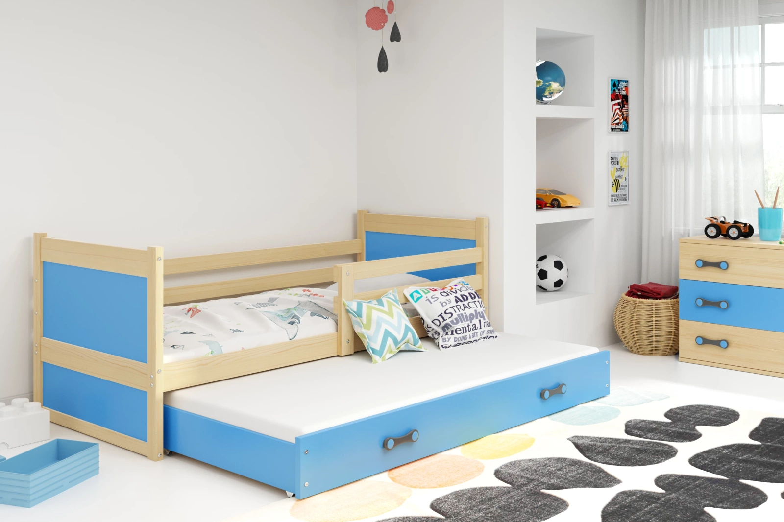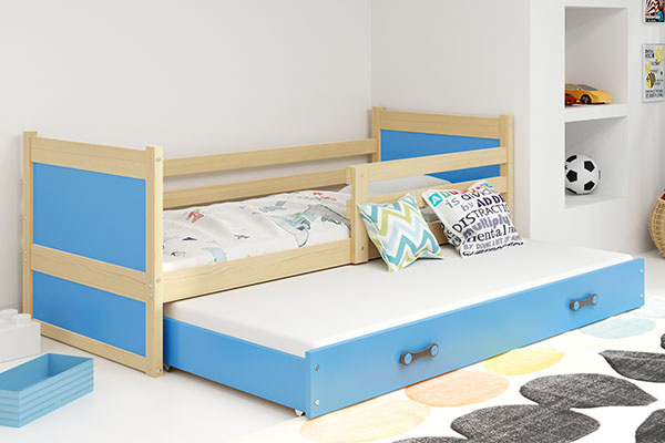 Je to ideální řešení pro vás, pokud hledáte řešení pro dvě děti a chcete optimálně využít prostor i v malém pokoji. Dvoumístná jednopatrová postel Rico je také skvělou volbou, pokud vaše dítě patří ke společenským dětem, které rády hostí své přátele. Spodní sedací část uzavřená ve výsuvné, stabilní a bezpečné zásuvce dokonale splňuje všechna očekávání. Lze ji totiž používat denně i příležitostně, a když je přes den schovaná, poskytuje více prostoru na hraní, které vaše ratolesti jistě ocení. Přírodní dřevo zateplí každou místnost. Modrá barva zásuvky dodává posteli lehce chlapecký nádech. Zádržná zábrana umožňuje montáž pro mladší dítě. Chrání před pády, i když váš poklad překypuje energií i ve spánku. Při instalaci se sami rozhodněte, na kterou stranu jej umístíte. Díky této všestrannosti se jedná o dlouhodobou investici. Rukojeti se zajímavým, lehce futuristickým designem představují další dekorativní prvek.Postel se prodává s pružným rámem, který poskytuje stabilní oporu a usnadňuje zaujmutí správné polohy při spánku.