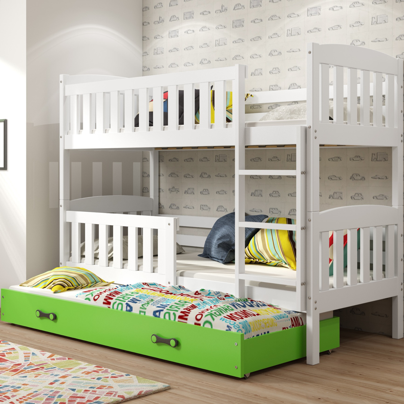 Třímístná postel pro mládež KUBUŚ 90X200 s matrací a zásuvkou, bílá/zelená