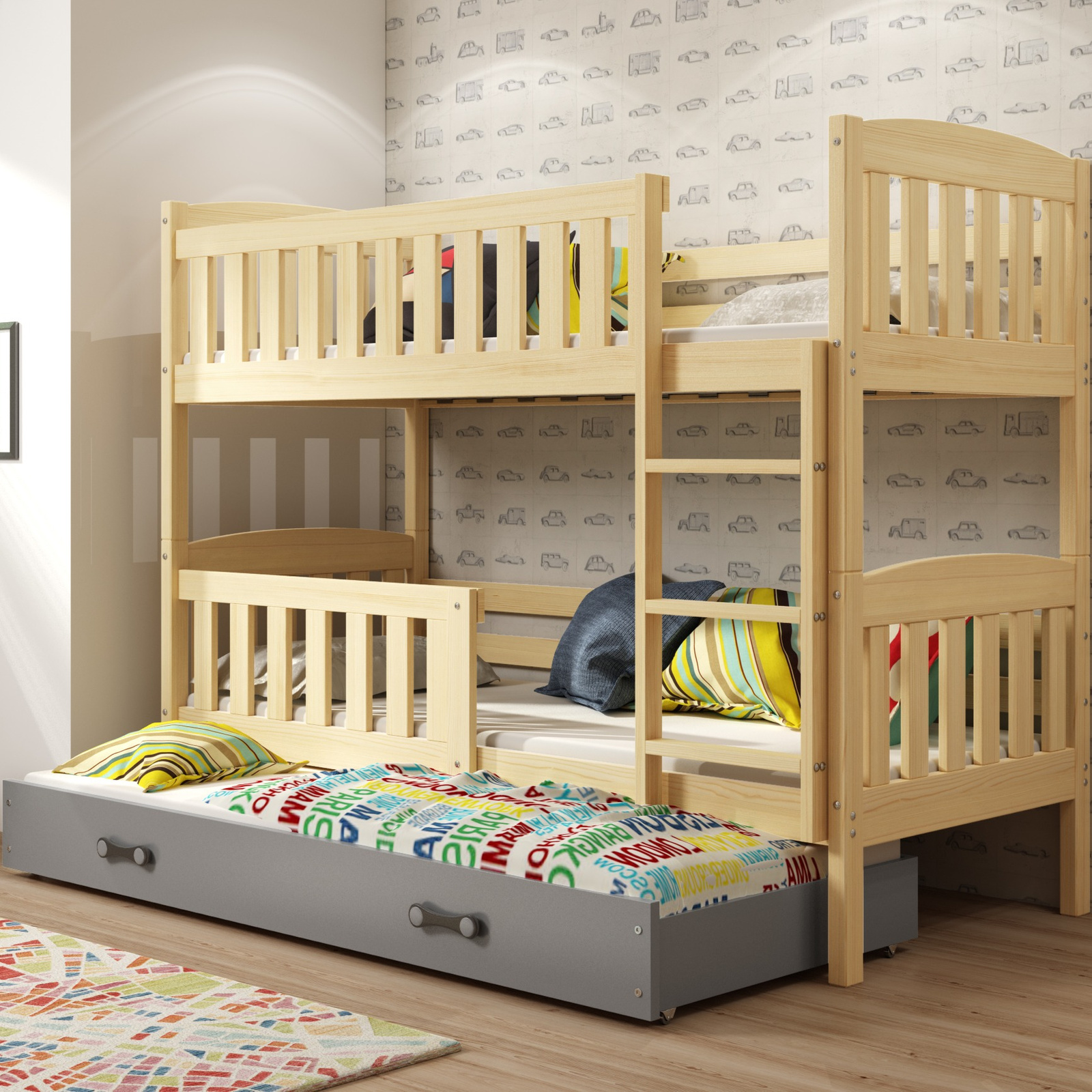 Třímístné lůžko Kubuś bylo vytvořeno s ohledem na větší rodiny. Umožní vám přizpůsobit jeden pokoj i pro tři vaše děti. Ve dvou obývacích prostorech je možné instalovat zábrany, které chrání zaneprázdněné batole před pádem a zajišťují jeho pohodlí a váš klid. Třetí lůžko je chytře ukryto v zásuvce pod postelí z odolné dřevotřísky. Může sloužit jako místo každodenního odpočinku pro jiné starší dítě nebo příležitostně pro kamarády vašich dětí, kteří se rozhodnou zůstat přes noc. Konstrukce je vyrobena z robustního borovicového dřeva a vyztužena ocelovými šrouby, které zároveň působí jako zajímavý dekorativní prvek. Žebřík lze namontovat na pravou nebo levou stranu. Rám z pružinových březových lamel poskytuje pohodlnou a stabilní oporu páteři a zlepšuje kvalitu spánku. Přírodní dřevo zateplí každou místnost.