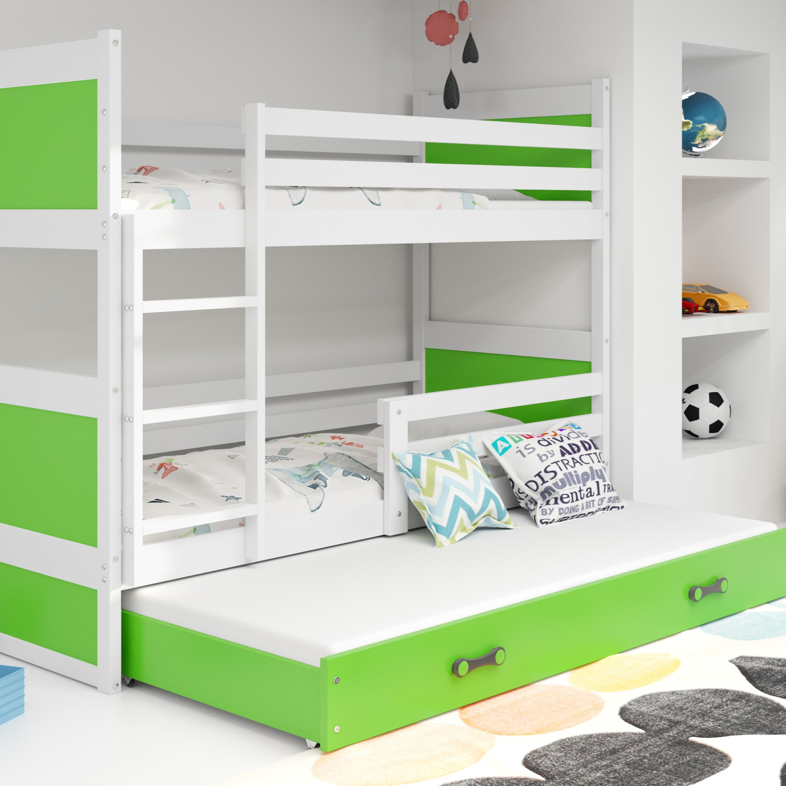 Třímístná postel pro mládež RICO 90X200 s matrací a zásuvkou, bílá/zelená