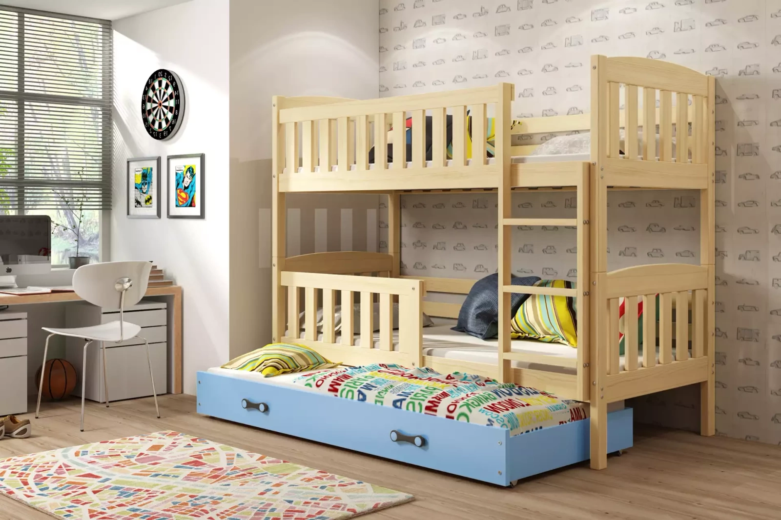 Trojlůžko pro mládež KUBUŚ 90X190 s matrací a zásuvkou, borovice/modrá