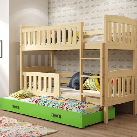 Trojlůžko pro mládež KUBUŚ 90X200 s matrací a zásuvkou, borovice/zelená