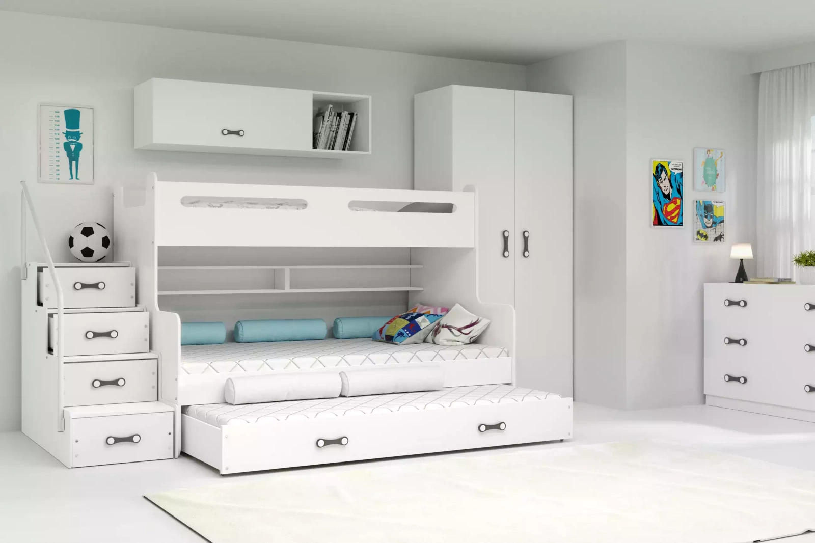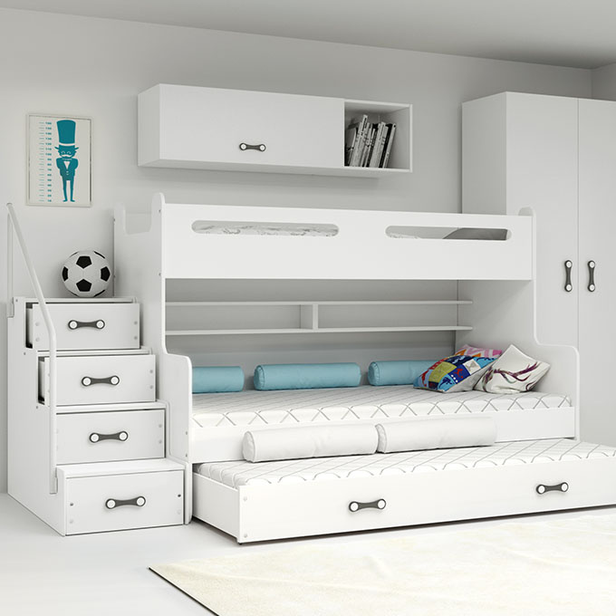 Malá velikost dětského pokoje nemusí znamenat, že nákup vkusného nábytku do obývacího pokoje bude obětován na úkor jeho praktičnosti. Postel Max 3 je toho dokonalým příkladem! Patrový model se třemi spacími plochami je skvělým řešením pro pokoj tří sourozenců podobného věku nebo dvou dětí, které často přijímají hosty přes noc.