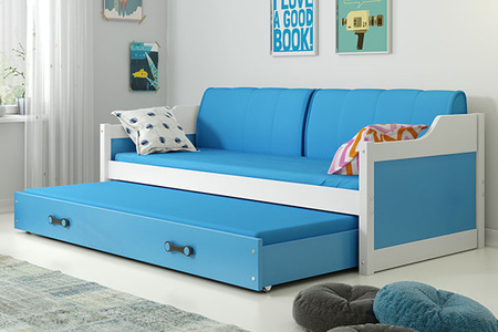Výsuvná postel pro mládež DAWID 90X200 s matrací a zásuvkou, bílá/modrá