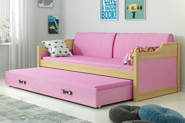Výsuvná postel pro mládež DAWID 90X200 s matrací a zásuvkou, borovice/růžová